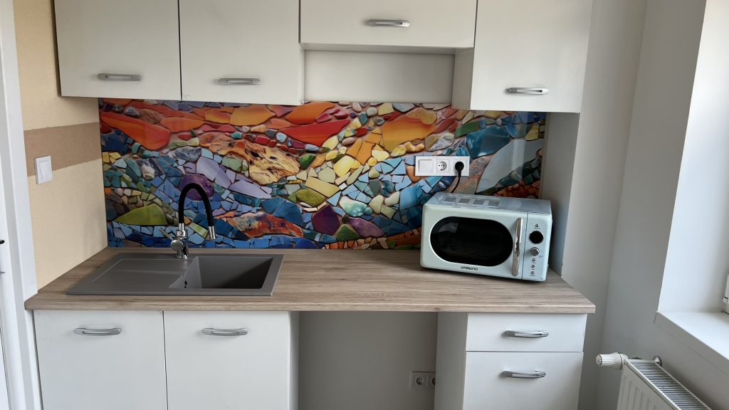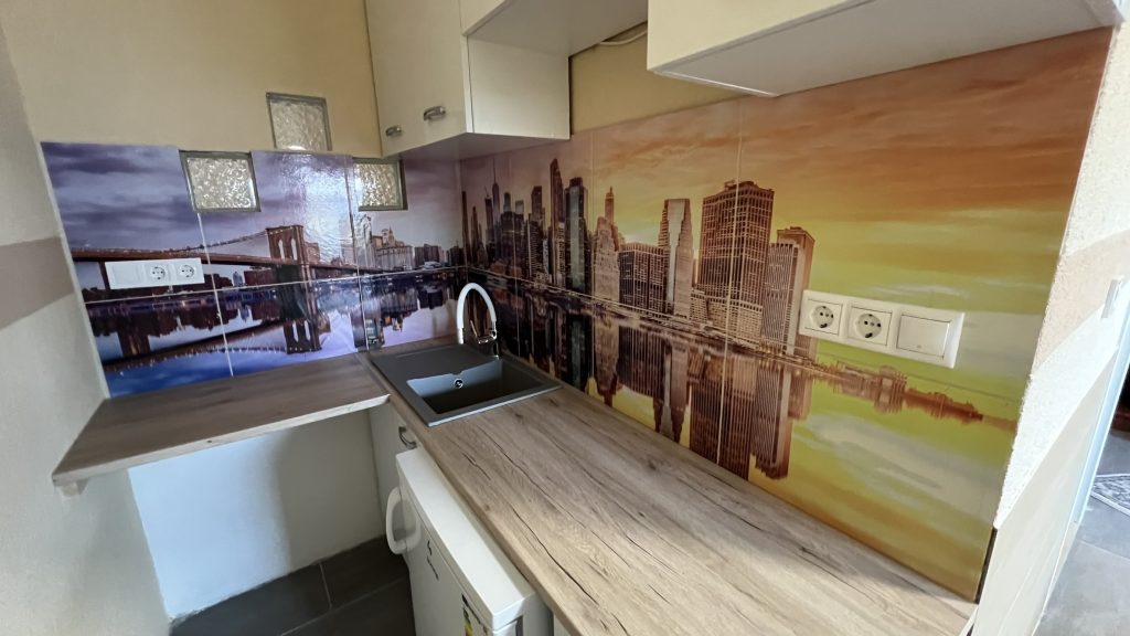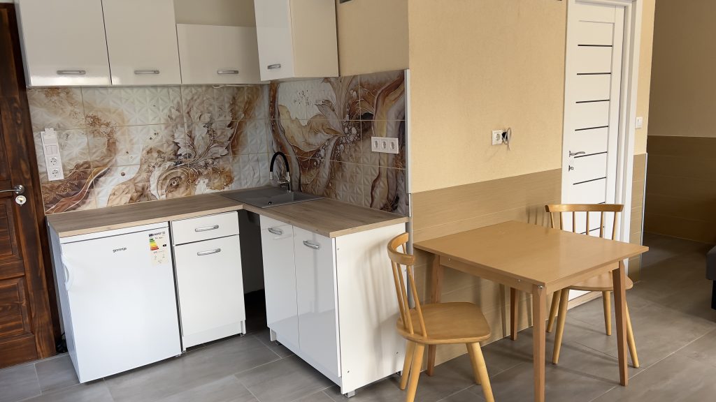 Felszereltsége: Indukciós főzőlap, micro, mosogató, hűtőszekrény, vízforraló, edények, tányérok, poharak, stb.